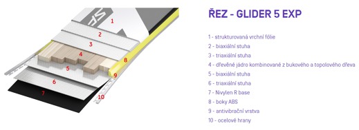 EXP značí ještě více rozšířenou konstrukci. Dobře zvládá rozbité sjezdovky a ani volný terén jí není cizí. Umí odpustit chyby či únavu. Dřevěné jádro složené z mnoha lamel výběrového dřeva pro skvělou stabilitu. Lehce zvednutá přední část lyže (rocker) usnadňuje nájezd do oblouku a lépe vede. Přináší radost z celodenního lyžování. GLIDER 5 EXP se dodává s deskou Allride PR base a vázáním Tyrolia PRD 12 MBS. Allmountain